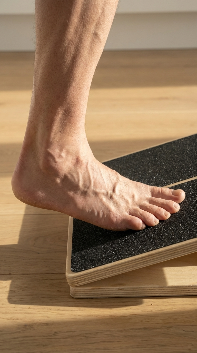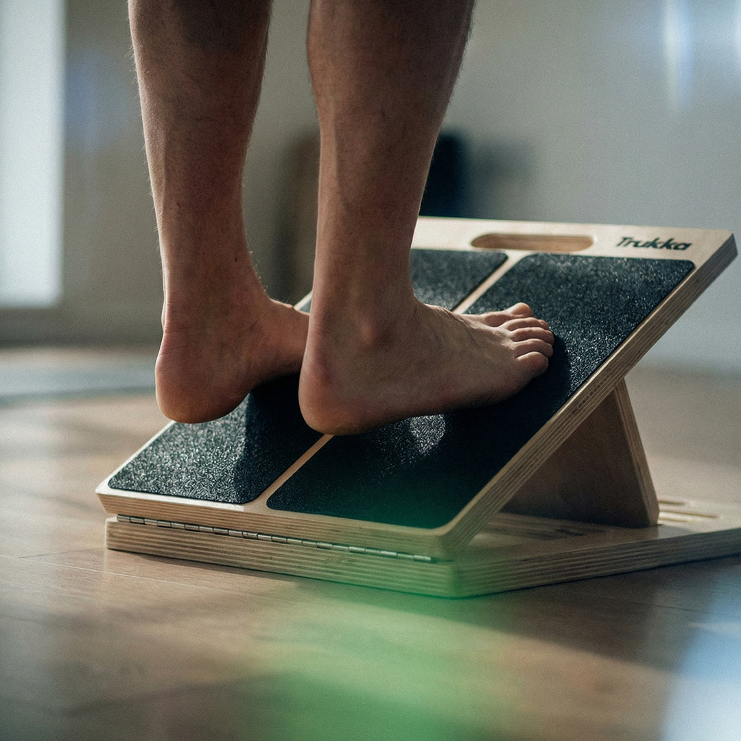 Lutningen tvingar vadmuskulaturen och hälsenan att arbeta excentriskt — precis det träningsmoment som forskning visar fungerar vid rehabilitering.